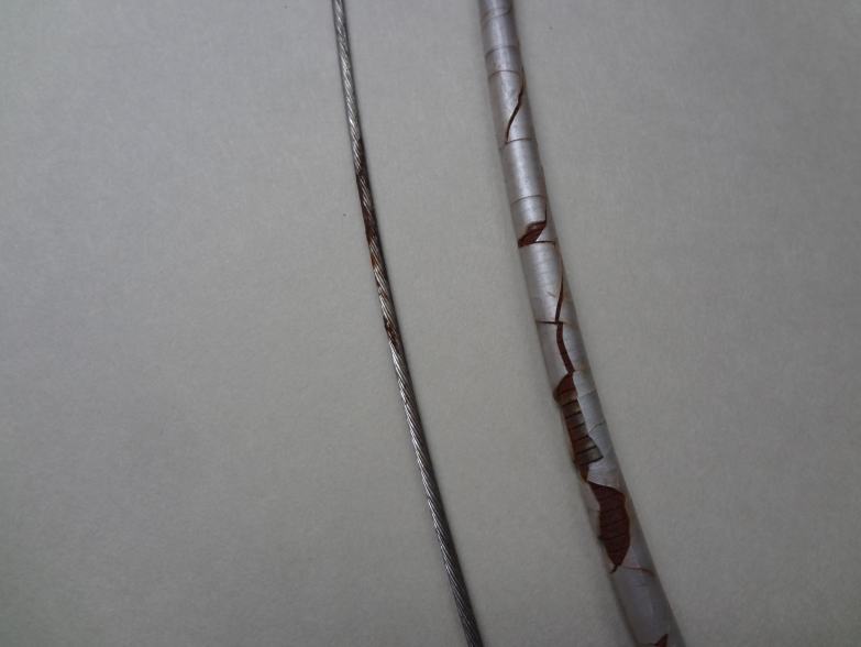 ブレーキワイヤのアウタにひびとさびがひどいので動作はしますが交換しました。アウタの長さは変更ありませんので同じ長さにカットしました。タイコの部分にグリス、アウタの内面に自転車オイルを塗布して組み立てます。アウタのエンドキャップなどは付いていたものを再利用します。アウタのひびとさびがひどかったので、インナーワイヤを引き抜いてみると、中にもさびが発生していました。タイコ周辺のワイヤにもさびが出ています。
