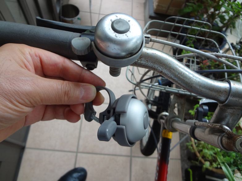 ベルの鳴りが悪くなったので交換しました。操作のしやすい位置に、ベルが動かないように、また、ねじ山を壊さないようにドライバーでしっかり押し付けながらねじを回して固定します。ベルは、危険なところ、見通しの悪いところ、標識で鳴らさなければならないところで使います。