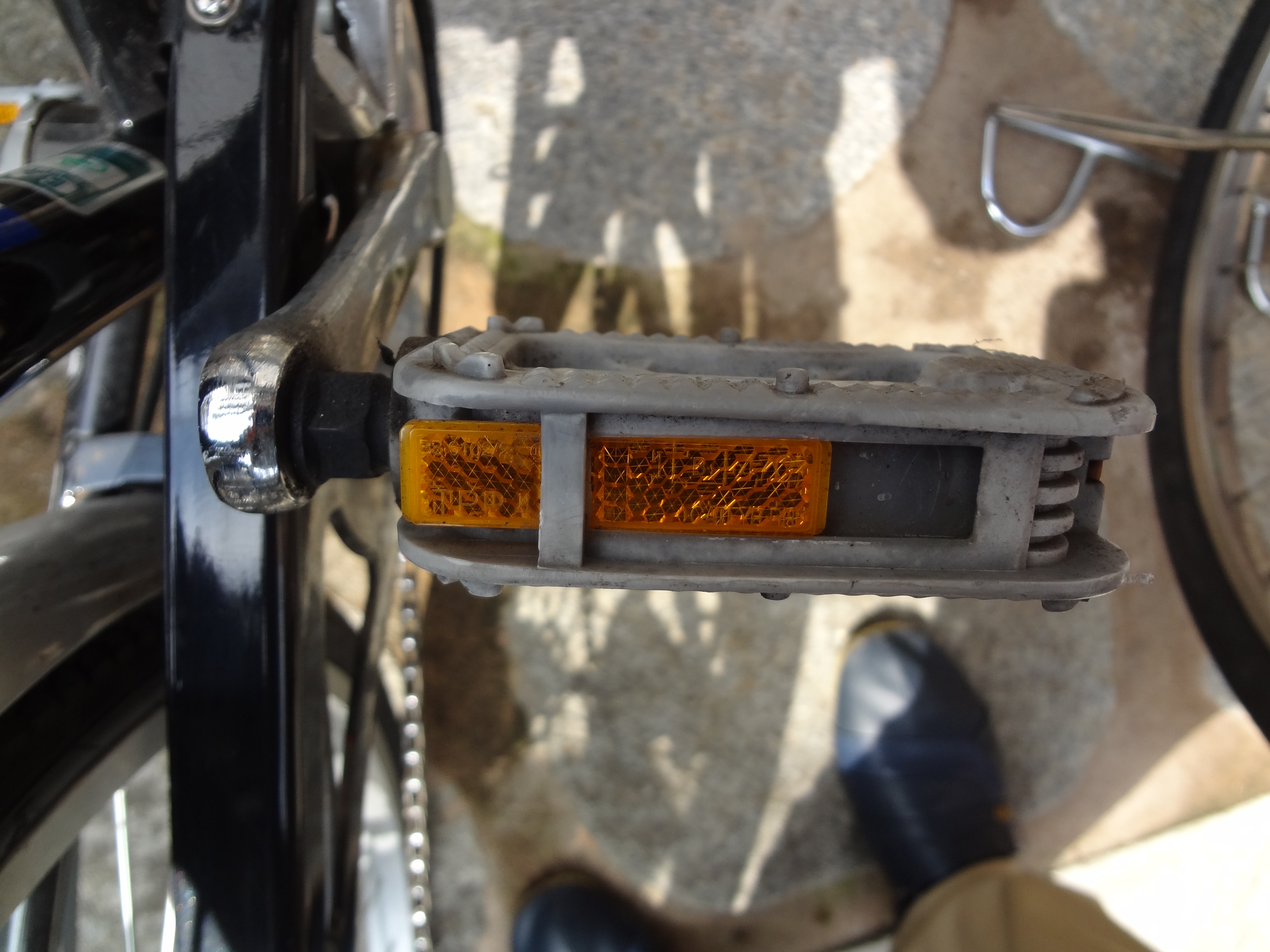 気が付かないことが多いのですが、ペダルリフレクタが外れてくる製品(ペダル)があります。よく点検をして元の位置に戻しておきましょう。ペダルリフレクタがペダル体のフックにしっかりはまっていなかったのか、構造が悪く外れてきてしまったのかは確認していないのでわかりませんが、注意が必要です。