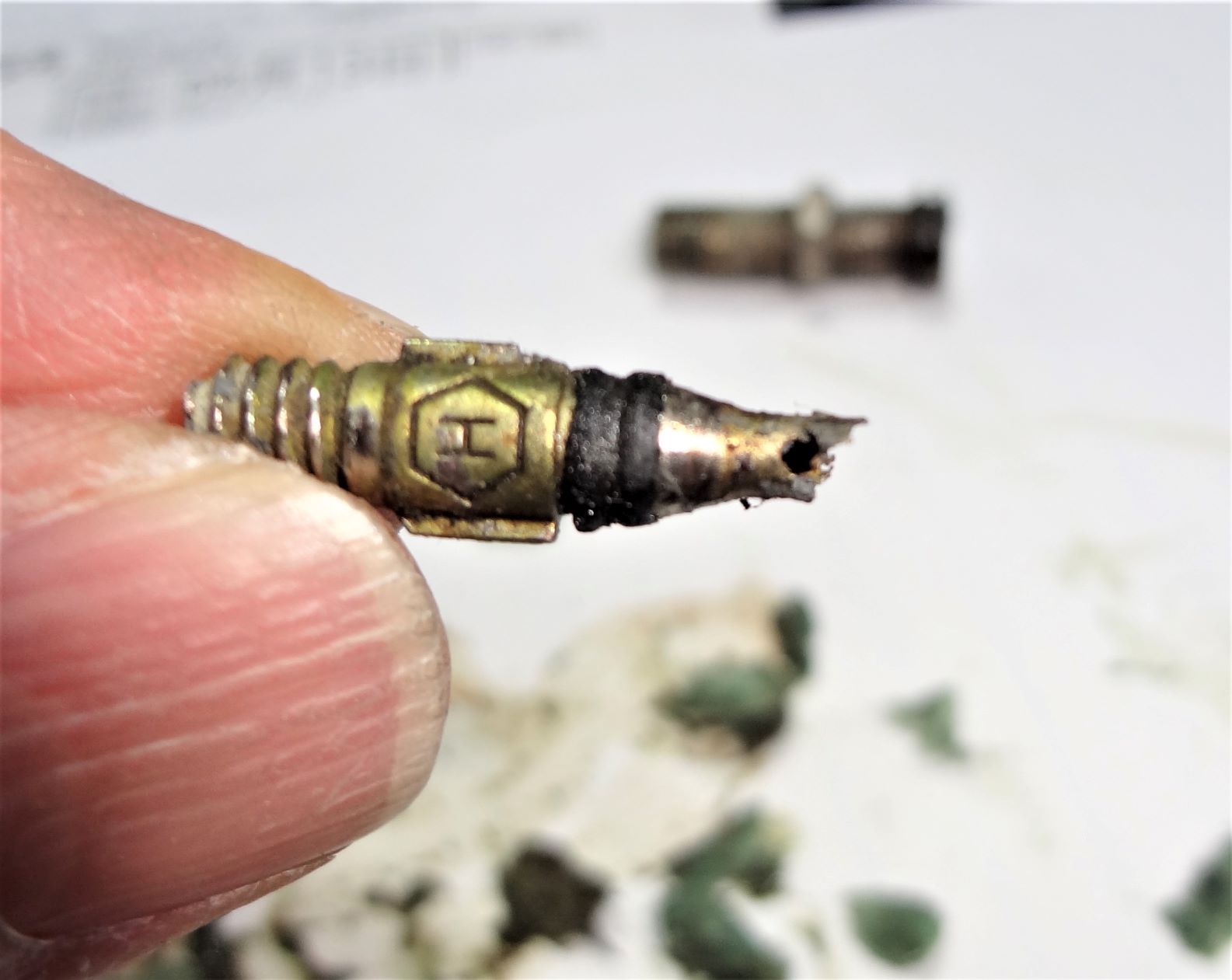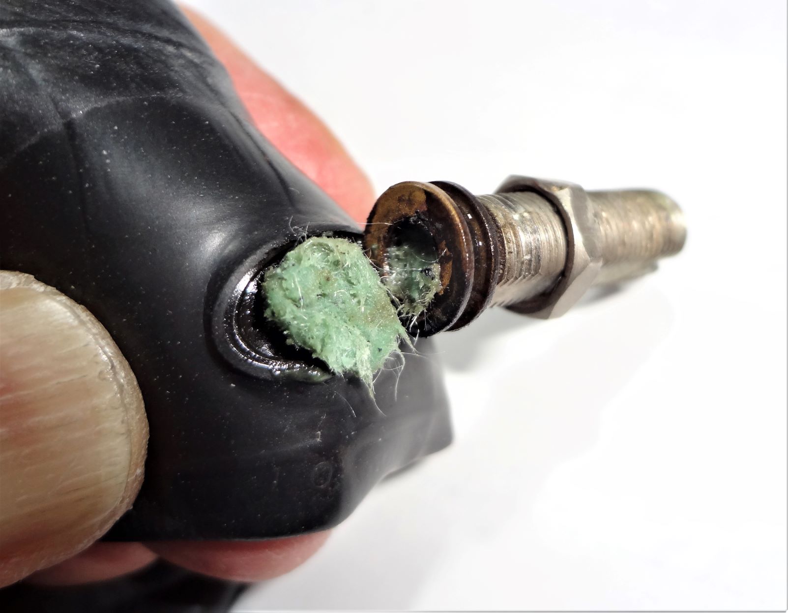 空気が入らないということで、タイヤ及びチューブ交換にシティー車が持ち込まれた。タイヤ及びチューブ交換が済みチューブを確認すると、パンク防止剤が注入されていて、防止剤の成分の繊維がチューブの中で絡み合って団子になり、小さな塊が幾つか出てきた。不思議な気持ちだった。サンプルを保存する目的があったのでタイヤからきれいに取れてしまったバルブも異常だが、塊を取付部から取り出したので全部は出せず、中でゴロゴロしているのでまだチューブの中に残っている。防止剤のネットリした緑色の液体はあまり出てこなかった。プランジャーは空気の通り道の穴から下が腐食して、空気入れの圧力でちぎれてなくなっていた。パンク防止剤による腐食が原因と推察されるが、とにかく驚いた。このような状態では修理どころかチューブ交換しか方法がない。パンク防止剤注入に1500円程度かかるでしょうから、注入は十分検討してからでよいのではないか。