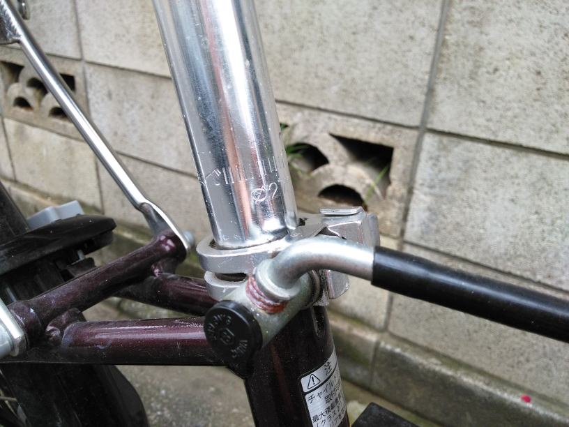 ダイナモが正規の位置から少し前かかがみになっていました。ダイナモの回転軸が前輪のハブ軸(車輪の中心)に向くように調整しました。ダイナモのローラーでタイヤを傷つけてしまいますので注意が必要です。